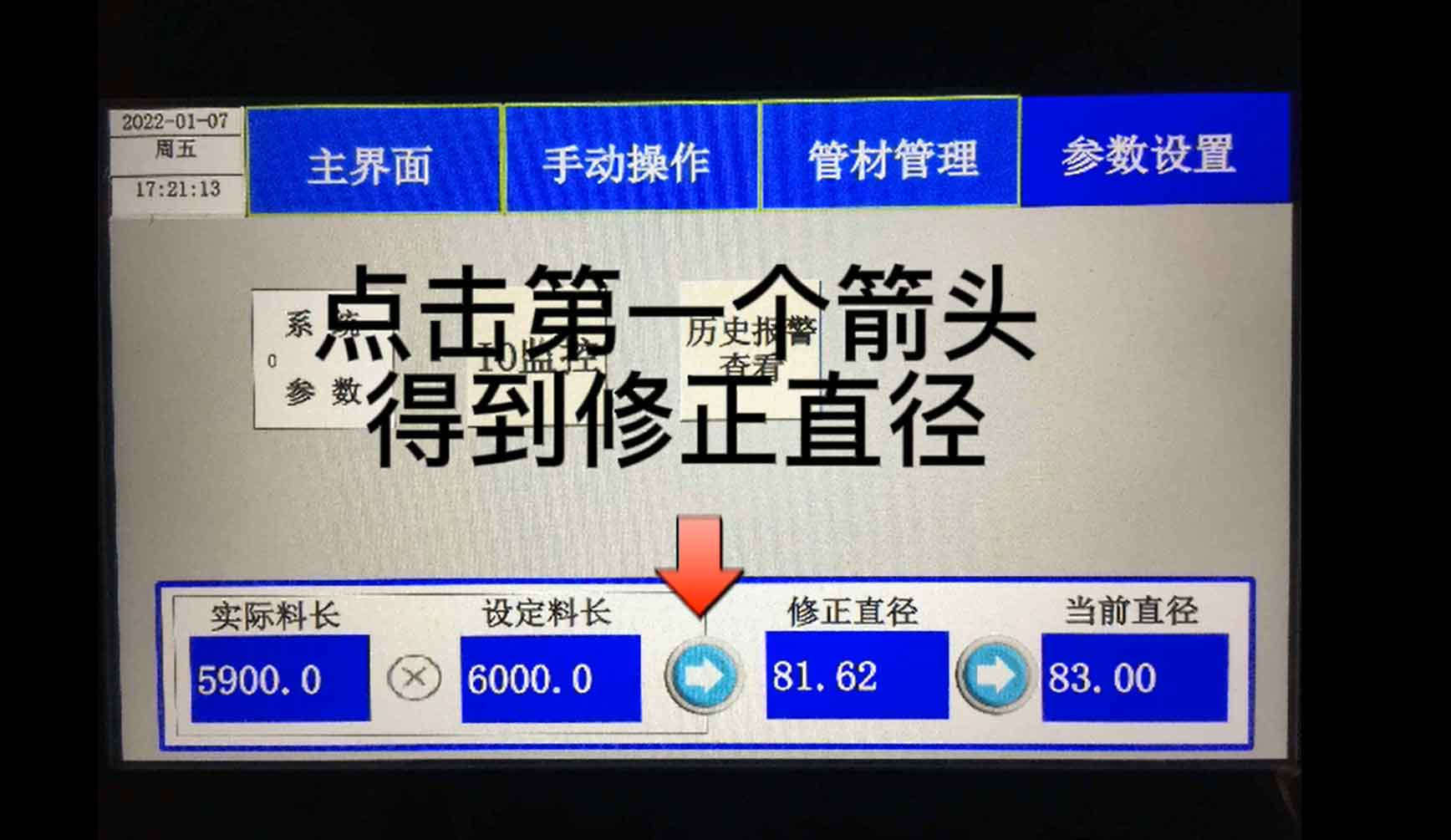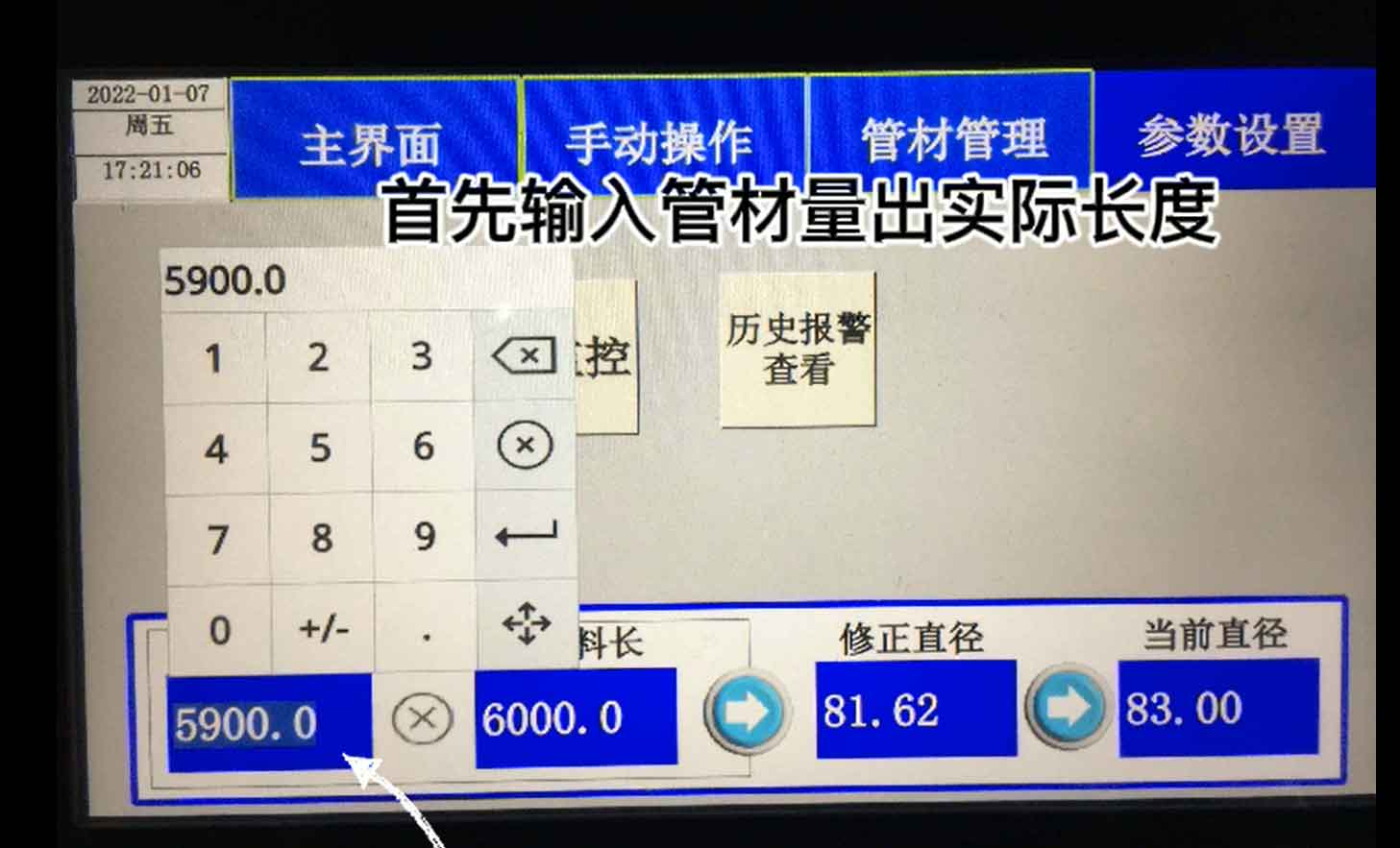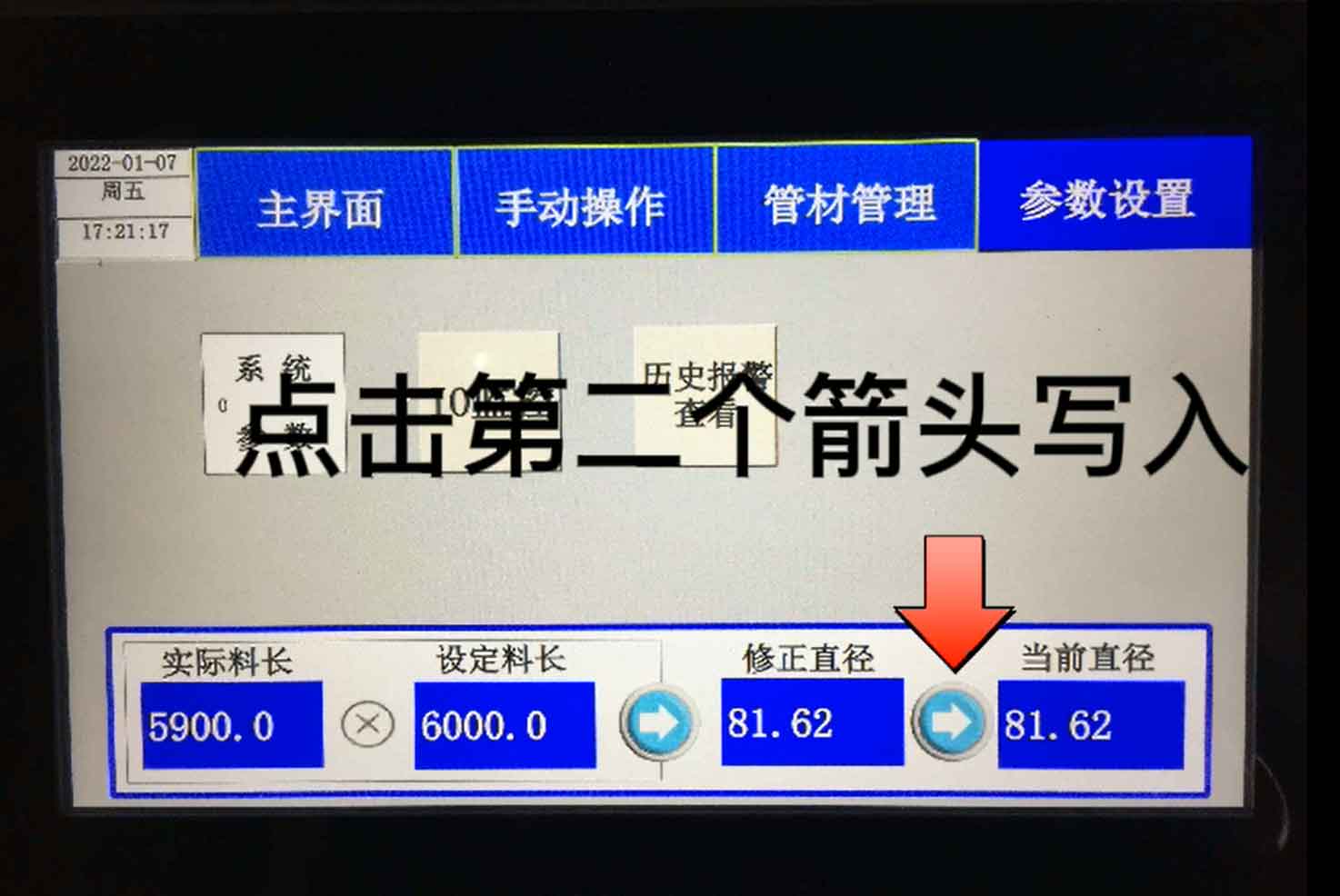 如實(shí)際長度與設(shè)定長度不符合,需在參數(shù)設(shè)置的下方 (實(shí)際長度)框里把量出來的管長輸入,再點(diǎn)擊第一個(gè)箭頭 ,然后會(huì)得到修正系數(shù),再點(diǎn)擊第二個(gè)箭頭給定。當(dāng)前系數(shù)變?yōu)樾拚禂?shù)即可!!! 注:實(shí)際管長和設(shè)定長度必須標(biāo)準(zhǔn)!!!如校準(zhǔn)后沒有變化只需重復(fù)以上操作即可!!!